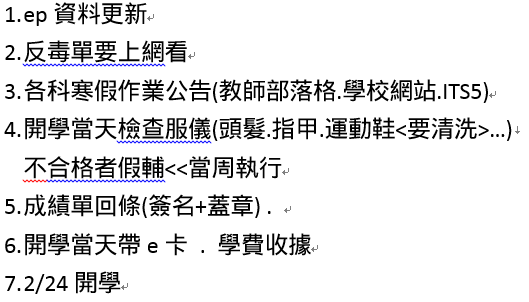 1. ep資料更新 2. 反毒單要上網看 3. 各科寒假作業公告(教師部落格.學校網站.ITS5) 4. 開學當天檢查服儀(頭髮.指甲…),不合格者假輔<<當周執行