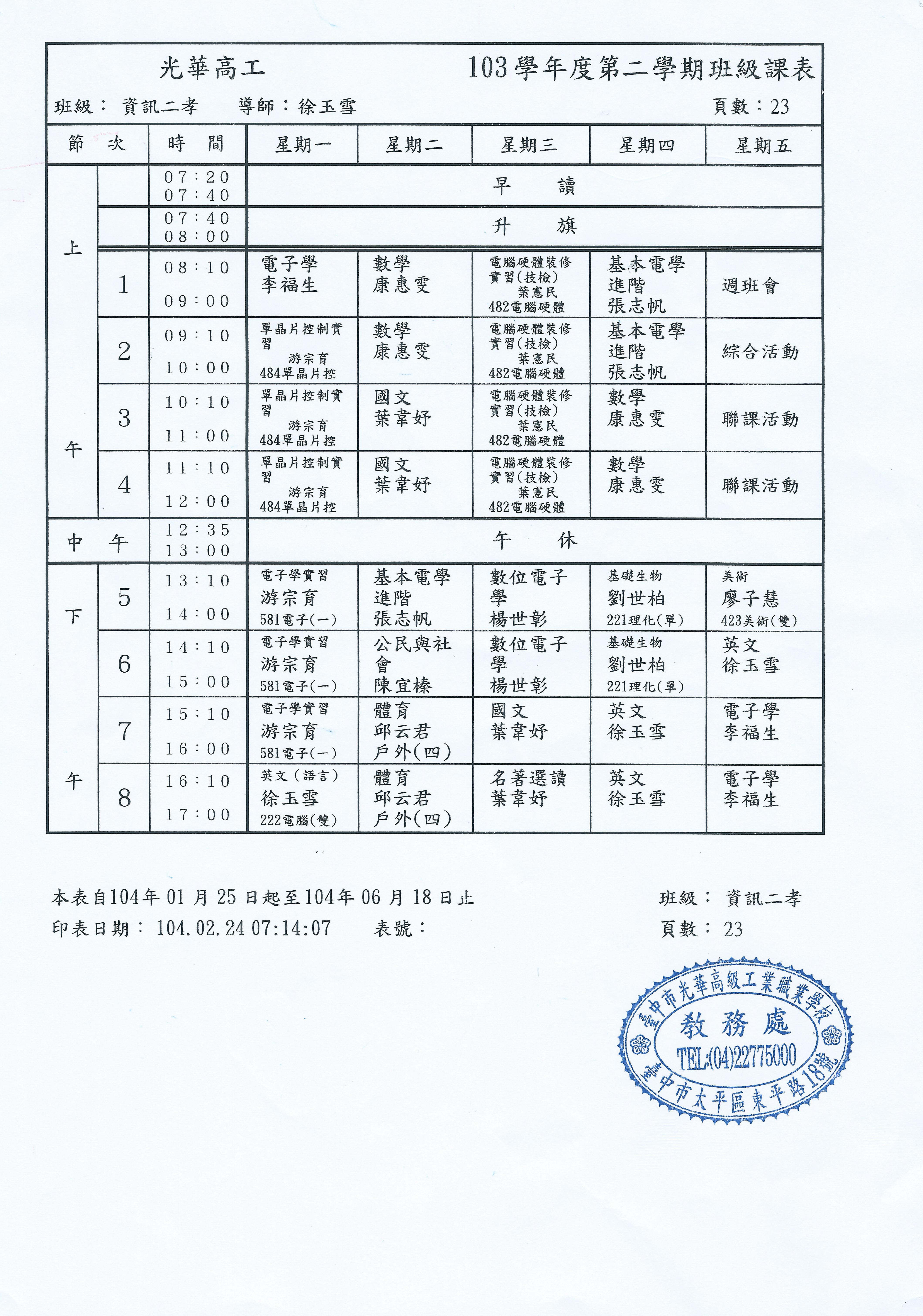 數學 (藍) 、公民 (淺黃) 、電子學實習 (粉) 、單晶片 (藍) 、 英文 (深黃)、週記 (綠)、基電 (綠)、體育 (粉)、硬體 (綠)、 數位電子 (淺黃)、國文(淺黃) 補帶英檢課本